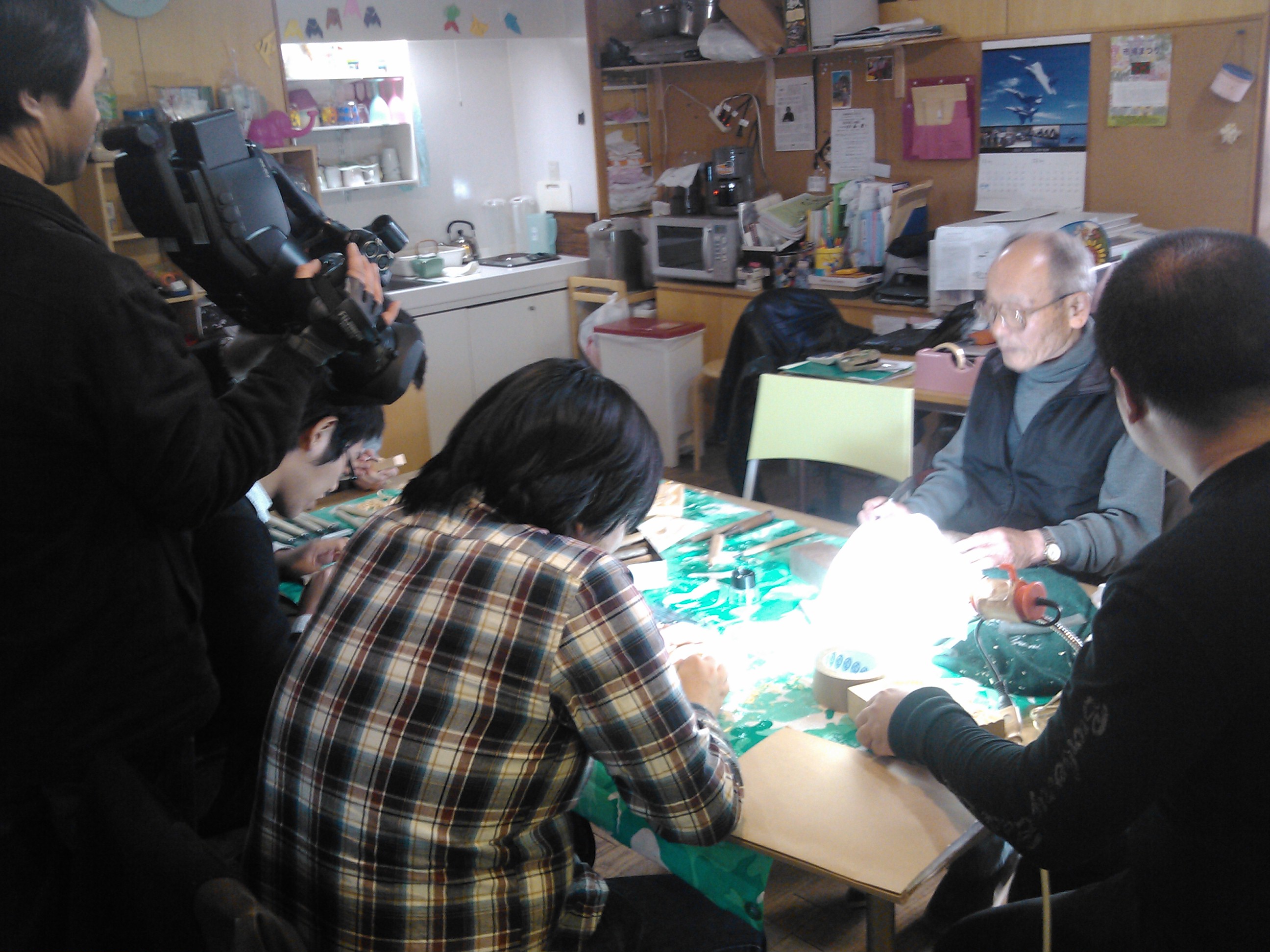 テレビクルーの方はさろんに着くやいなや、仏像彫刻の先生が作った作品の数やその精巧さに驚かれ、早速カメラを回していました。また、作品だけでなく先生自作の彫刻刀にも注目され、大工として活躍していた頃の話や、どのような気持ちで仏像を彫られているのかなど、矢継ぎ早にインタビューしていました。先生は、少し緊張されていましたが、私たち学生や地元の方と仏像彫刻をしていることはとても楽しいと答えられ、これからもこの講座を続けていきたいとの意気込みをおっしゃっていました。